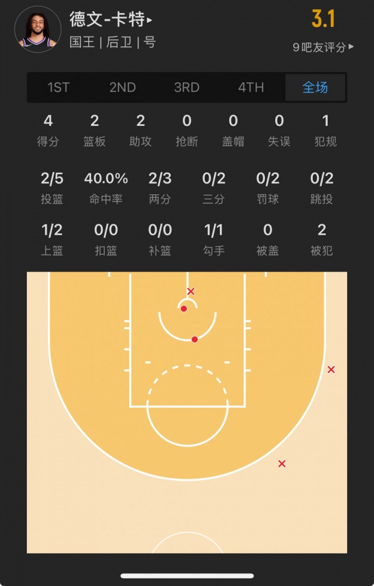 國(guó)王13號(hào)秀 德文-卡特 登場(chǎng)20.1分鐘