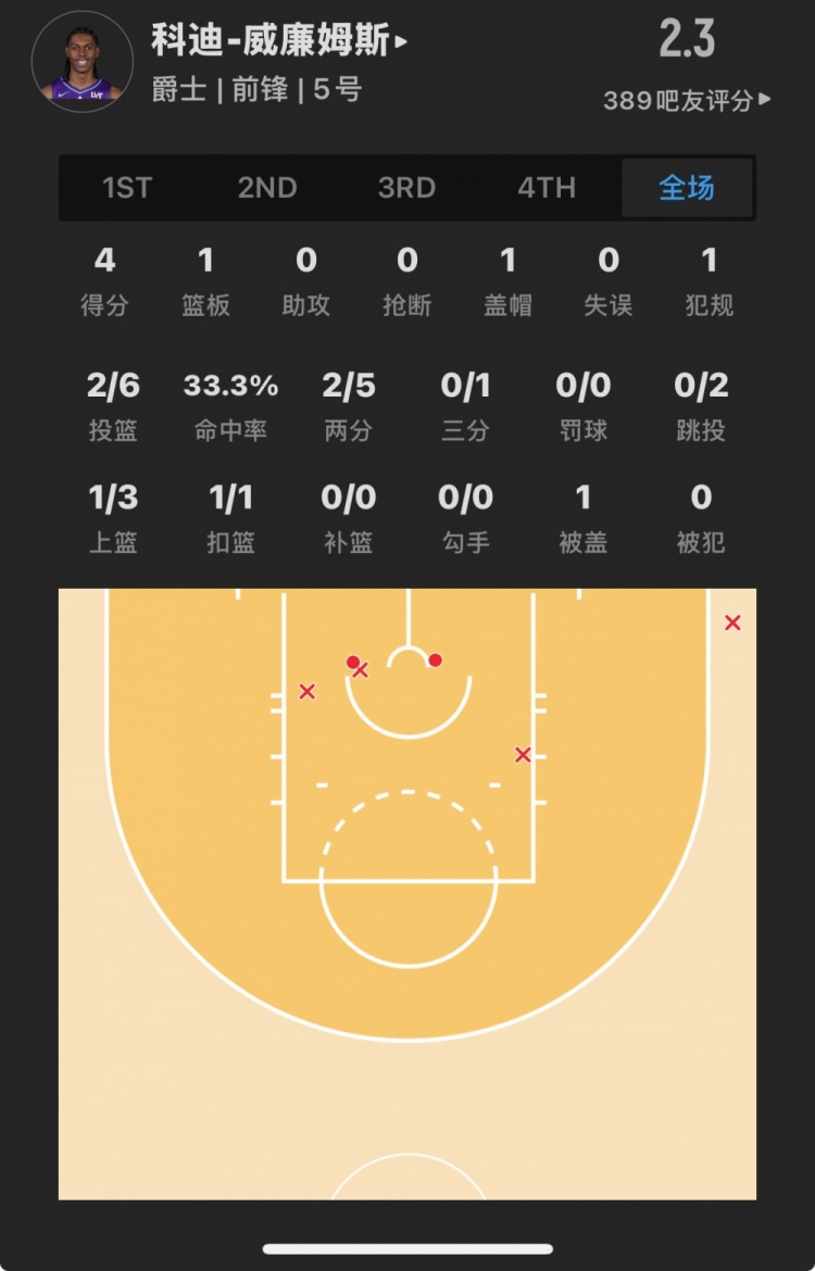 爵士10號秀 科迪-威廉姆斯 登場21.3分鐘