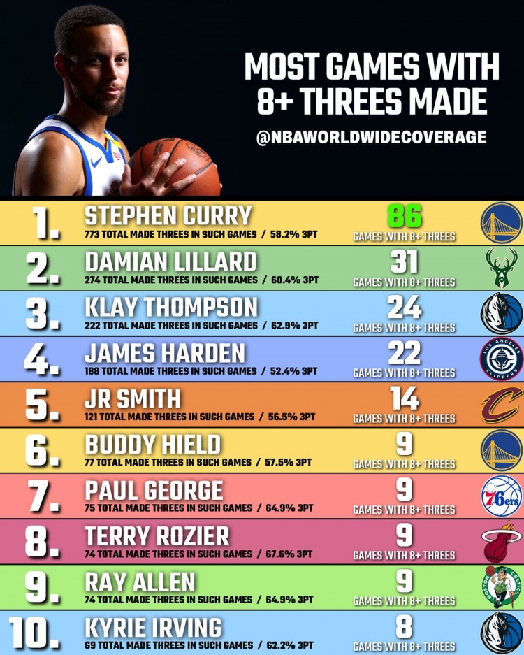 發(fā)布時(shí)間:2025年01月09日 05:50點(diǎn)擊:欄目:籃球新聞 除特別注明外,本站所有內(nèi)容均為九球直播整理排版,轉(zhuǎn)載請(qǐng)注明出處:太夸張了!庫里生涯86次單場(chǎng)至少8記三分 期間命中率達(dá)58.2% 本文標(biāo)簽: 籃球 nba 西部 勇士 庫里
