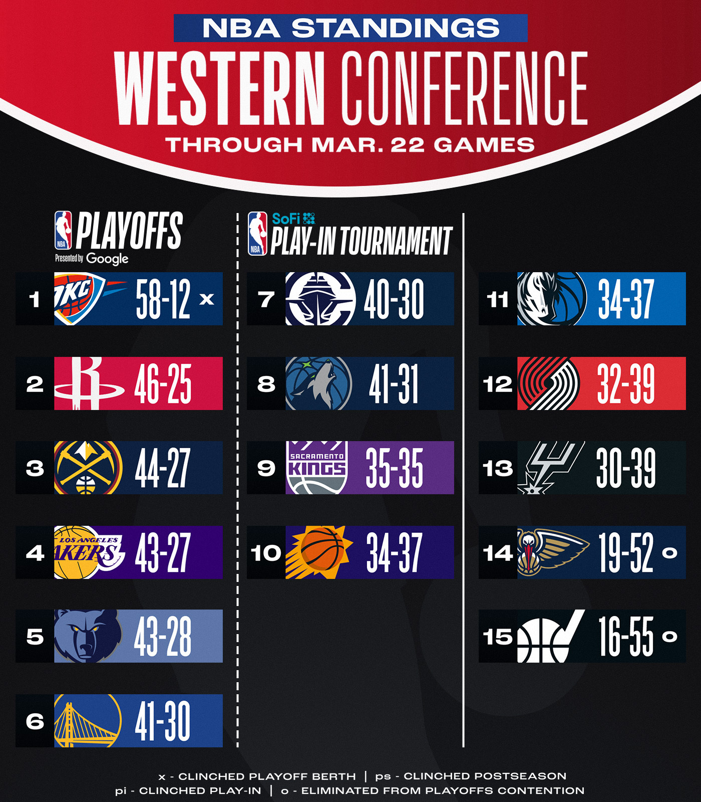 湖人主場慘敗公牛31分,被掘金超越跌至西部第4;勇士6連客首戰(zhàn)輸給老鷹,繼續(xù)排在西部第6,只領(lǐng)先第7的快船和第8的森林狼0.5個勝場。