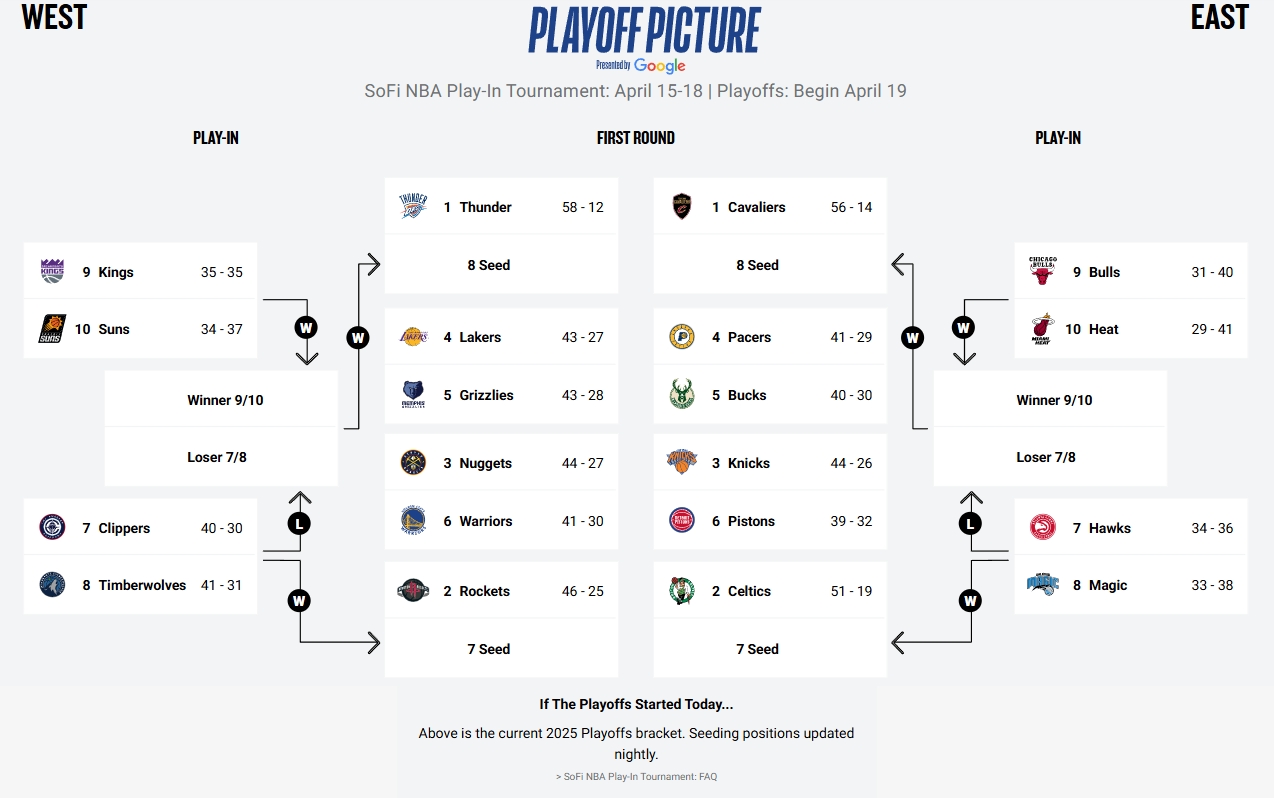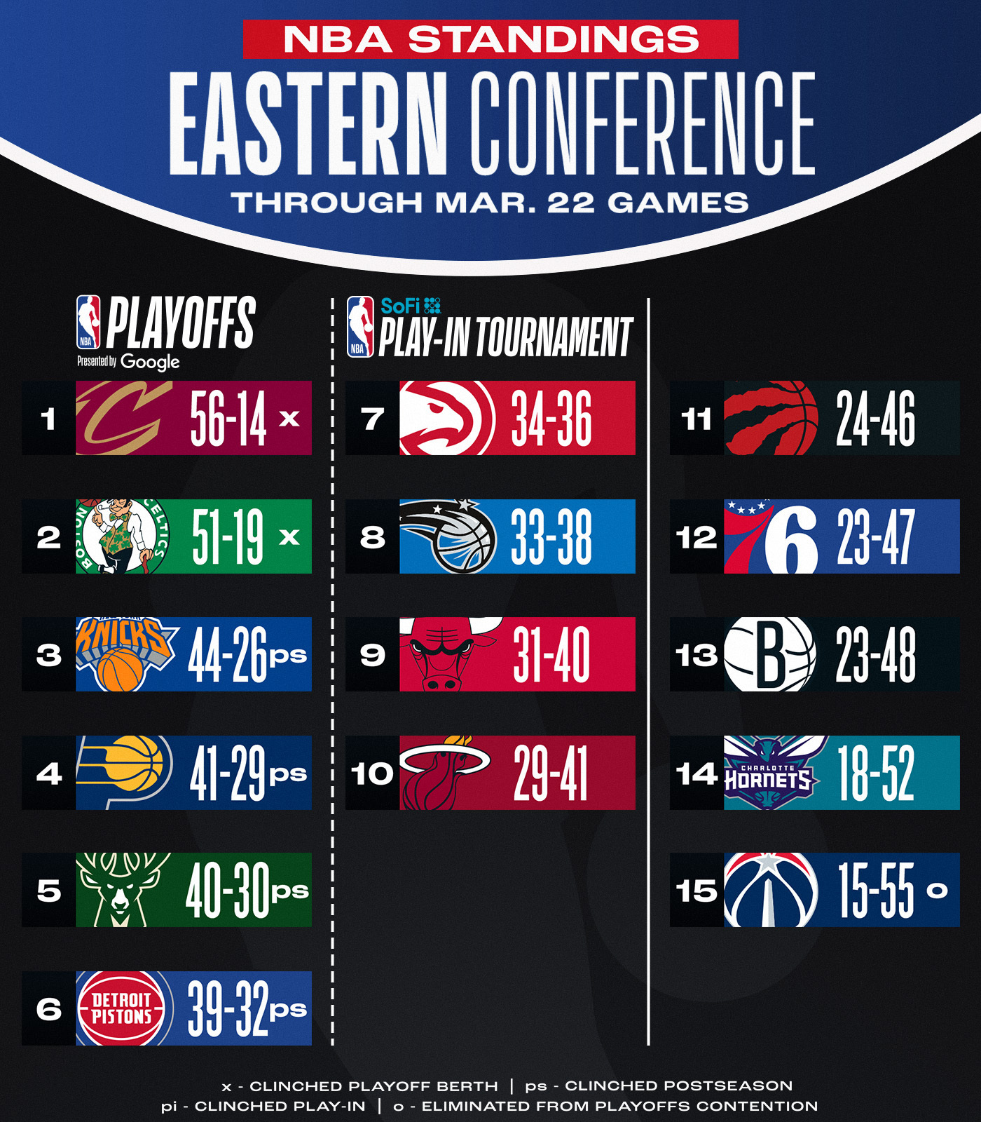 第4的步行者和第5的雄鹿都贏球,勝場差還是1個;老鷹取勝后領(lǐng)先第8的魔術(shù)1.5個勝場;公??蛨龃髣俸?1分,領(lǐng)先第10的熱火1.5個勝場。