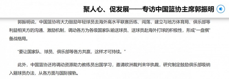 3月25日訊 籃協(xié)主席郭振明近日接受了新華社的專訪,談到了多個(gè)話題。其中一點(diǎn),他表示中國籃協(xié)將大力鼓勵(lì)年輕球員去海外高水平聯(lián)賽歷練、闖蕩。