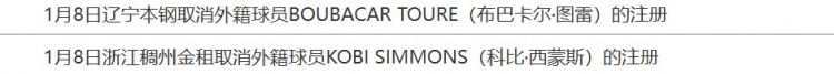 1月9日訊 CBA官網(wǎng)更新各隊(duì)外援注冊(cè)信息,遼寧取消注冊(cè)布巴卡爾-圖雷,浙江取消注冊(cè)科比-西蒙斯。