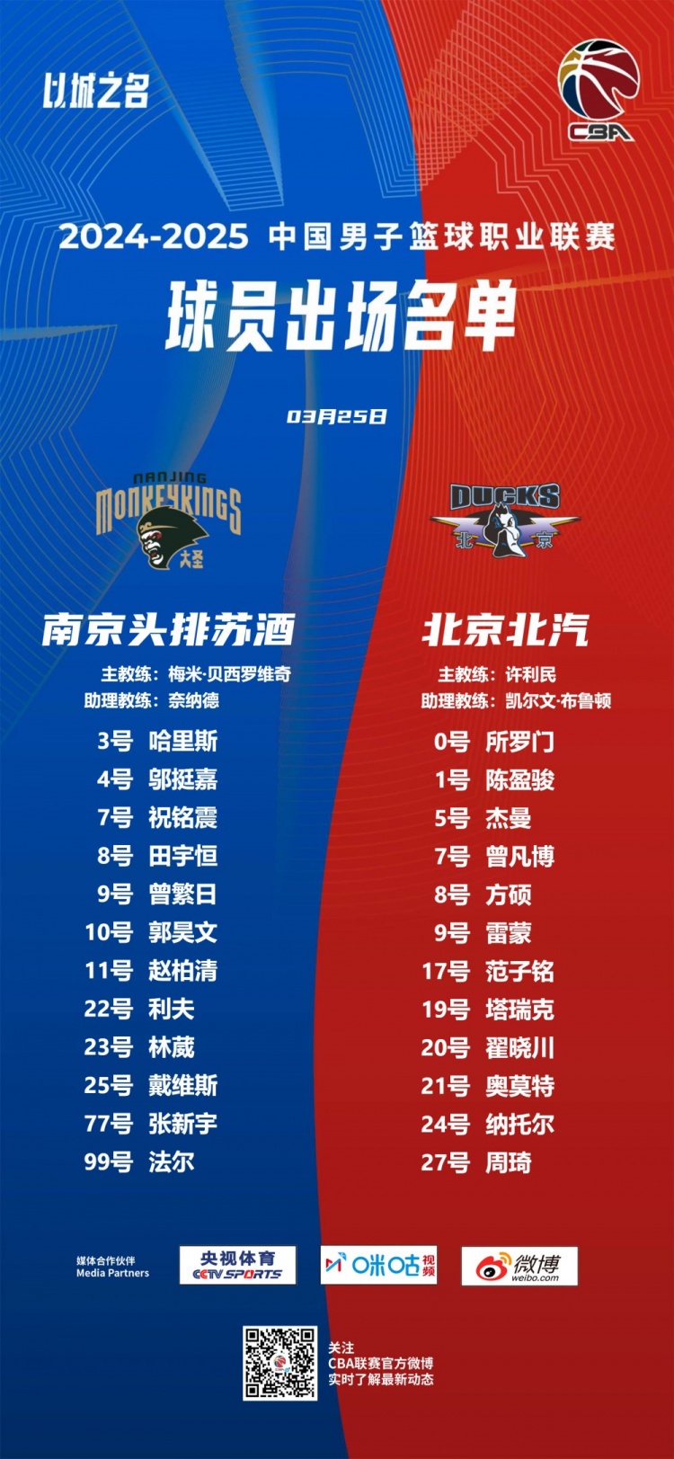 發(fā)布時(shí)間:2025年03月25日 20:03點(diǎn)擊:欄目:籃球新聞 3月25日訊 CBA常規(guī)賽,同曦將在主場(chǎng)迎戰(zhàn)北京。同曦大名單:哈里斯、鄔挺嘉、祝銘震、田宇恒、曾繁日、郭昊文、趙柏清、利夫、林葳、戴維斯、張新宇、法爾北京大名單:所羅門、陳盈駿、杰曼、曾凡博、方碩、雷蒙、范子銘、塔瑞克、翟曉川、奧莫特、納托爾、周琦 除特別注明外,本站所有內(nèi)容均為九球直播整理排版,轉(zhuǎn)載請(qǐng)注明出處:同曦VS北京大名單:郭昊文林葳領(lǐng)銜 陳盈駿和雷蒙復(fù)出 本文標(biāo)簽: 籃球 CBA 中國(guó)籃球 北京 同曦