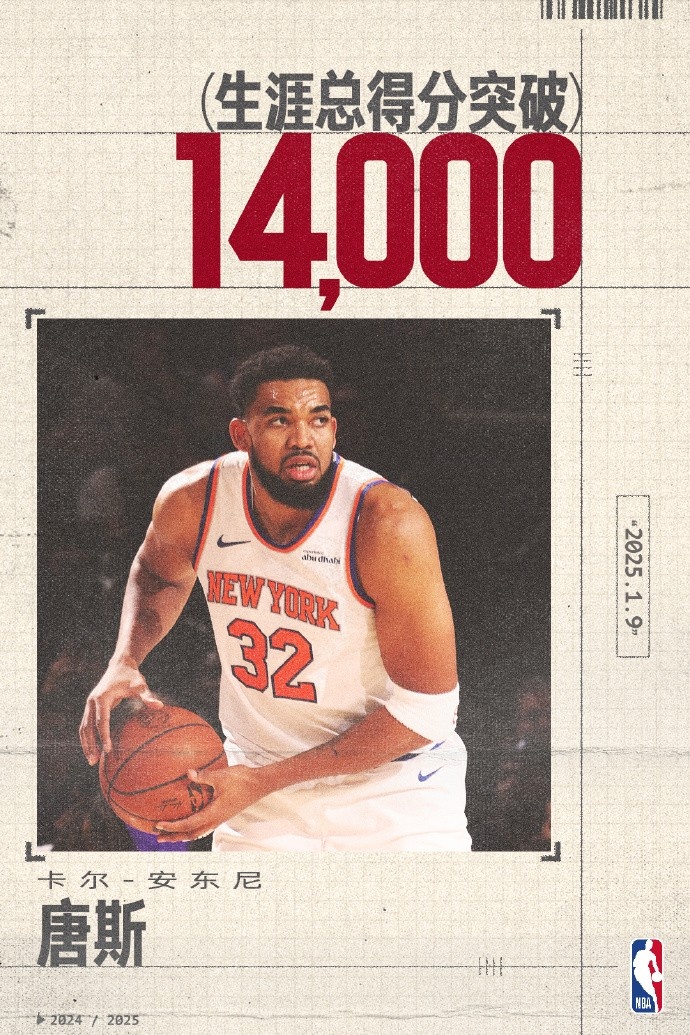 發(fā)布時(shí)間:2025年01月09日 10:51點(diǎn)擊:欄目:籃球新聞 1月9日訊 NBA常規(guī)賽,尼克斯vs猛龍。截至第四節(jié)初,唐斯本場(chǎng)拿下了25分。至此他個(gè)人生涯總得分突破了14000分大關(guān)(賽前13980分)。 除特別注明外,本站所有內(nèi)容均為九球直播整理排版,轉(zhuǎn)載請(qǐng)注明出處:里程碑!唐斯個(gè)人生涯總得分突破14000分大關(guān) 本文標(biāo)簽: 籃球 nba 尼克斯 唐斯