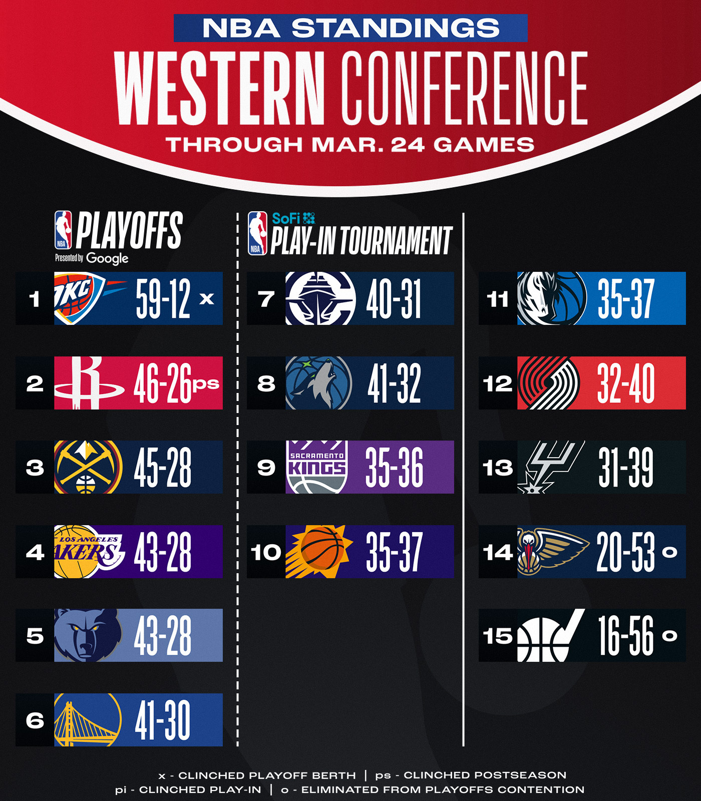發(fā)布時(shí)間:2025年03月25日 22:03點(diǎn)擊:欄目:籃球新聞 除特別注明外,本站所有內(nèi)容均為九球直播整理排版,轉(zhuǎn)載請(qǐng)注明出處:西部排名競(jìng)爭(zhēng)愈發(fā)慘烈 誰(shuí)能最終殺進(jìn)前十? 本文標(biāo)簽: 籃球 nba 西部 湖人 勇士 太陽(yáng) 火箭 獨(dú)行俠 快船 鵜鶘 開拓者 灰熊 森林狼 爵士 掘金 馬刺 國(guó)王 雷霆 小牛