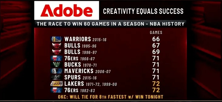 同時,雷霆僅用72場比賽就取得60場勝利,平歷史第八快。
