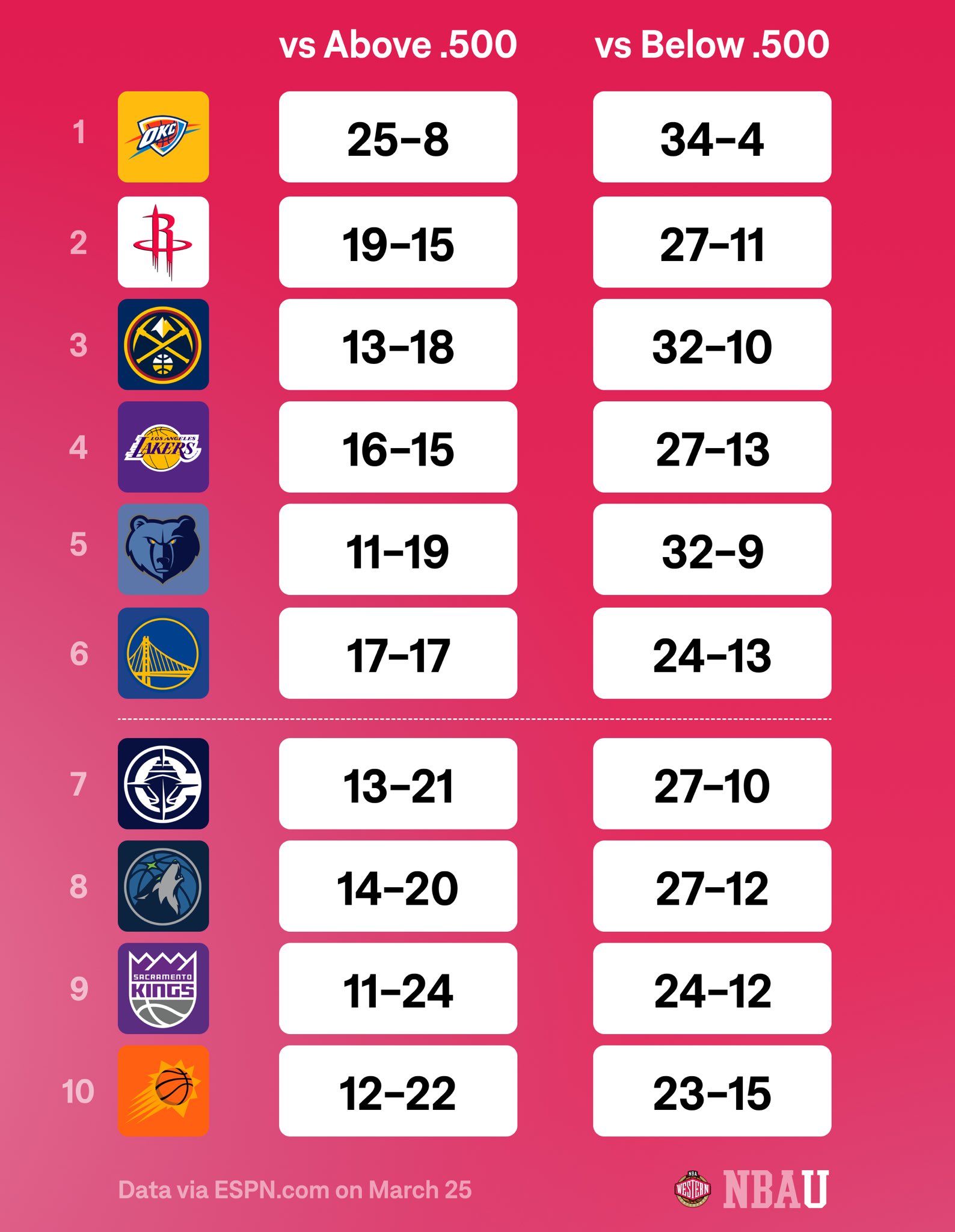 發(fā)布時(shí)間:2025年03月26日 13:03點(diǎn)擊:欄目:籃球新聞 除特別注明外,本站所有內(nèi)容均為九球直播整理排版,轉(zhuǎn)載請(qǐng)注明出處:有亮點(diǎn)?東西部TOP10球隊(duì)VS強(qiáng)隊(duì)&弱隊(duì)的勝率對(duì)比! 本文標(biāo)簽: 籃球 nba 西部 湖人 勇士 太陽(yáng) 火箭 獨(dú)行俠 快船 鵜鶘 開(kāi)拓者 灰熊 森林狼 爵士 掘金 馬刺 國(guó)王 雷霆 東部 76人 雄鹿 凱爾特人 籃網(wǎng) 猛龍 黃蜂 騎士 步行者 活塞 熱火 老鷹 公牛 奇才 魔術(shù) 尼克斯 小牛