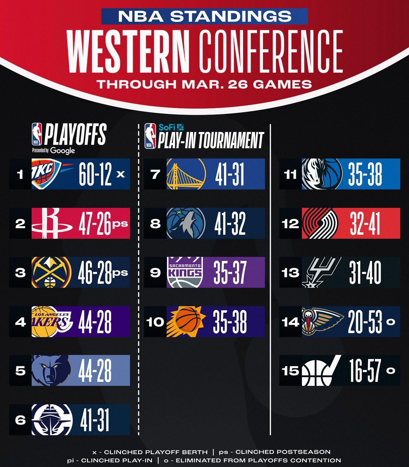西部排名情況:湖人重回第四,快船升至第六,勇士掉進(jìn)附加賽區(qū)域的第七!太陽輸球,戰(zhàn)績跟身后的獨(dú)行俠持平了!掘金保底附加賽了!