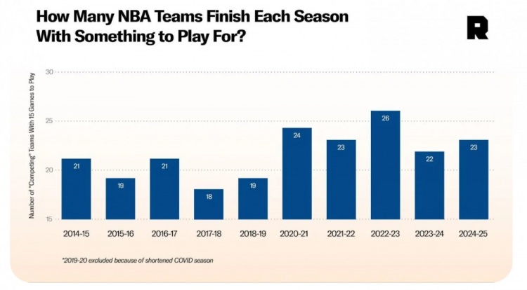 事實上,過去五個賽季的數(shù)據(jù)顯示,在常規(guī)賽剩余15場時,平均每年仍有23.6支球隊保有至少爭奪附加賽席位的希望。其中2022-23賽季尾聲階段多達(dá)26支球隊保有競爭資格,而上賽季同期最低也有22支。相比此前五年(2014-15賽季至2018-19賽季)19.6支球隊的平均值,新版制度讓競爭球隊數(shù)量提升了整整4支,畢竟參與季后賽的名額從16個擴充到了20個(含附加賽)。但關(guān)鍵在于,這一改變確實激勵了第11名及之后的球隊保持斗志。從效果來看,目標(biāo)基本達(dá)成了。