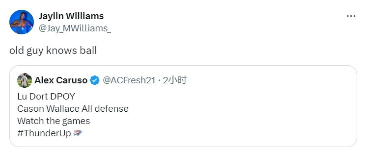 杰林-威廉姆斯對此也十分認(rèn)同,他轉(zhuǎn)發(fā)了卡魯索的這條動(dòng)態(tài),并在旁邊寫道:“老將懂球?!?/p>
