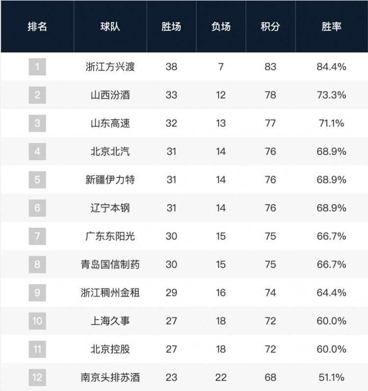 截止目前,第一名浙江廣廈、第二名山西汾酒、第十二名南京同曦已確認(rèn)季后賽落位。