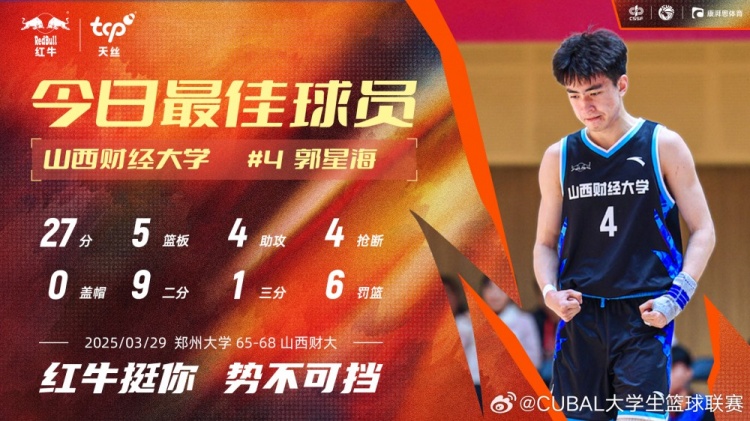 在山西財經(jīng)大學68-65險勝鄭州大學的激戰(zhàn)中,郭星海以27分5前場籃板4搶斷的全能表現(xiàn)幫助隊伍取得勝利。這位身披4號戰(zhàn)袍的鋒線悍將,在35分鐘內(nèi)交出籃下9投6中、中距離3投全中的完美答卷,更以一記冷血三分穩(wěn)定軍心。其5個進攻籃板直接轉(zhuǎn)化為8分的二次進攻,4次搶斷徹底打亂對手節(jié)奏,最終用這全能的數(shù)據(jù)為這場鏖戰(zhàn)畫下決勝注腳。
