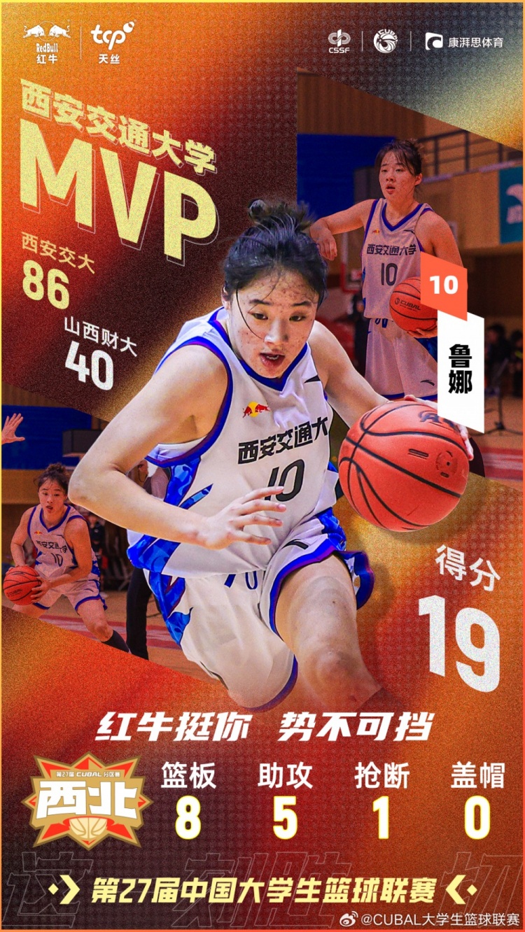 在西安交通大學86-40大勝山西財經大學的西北賽區(qū)決賽中,魯娜以19分8籃板5助攻的完美數據化身攻防樞紐。這位身披10號戰(zhàn)袍的后場指揮官,籃下10投6中展現強硬終結能力,中距離2投1中穩(wěn)定輸出,更以5次助攻盤活全隊進攻,1次搶斷則如手術刀般精準切斷對手反擊。這位低調的節(jié)奏掌控者證明:真正的統(tǒng)治力無需數據狂歡,認真做好每一次的攻防,在每記突分中洞穿防線,用最樸素的全面性為勝利奠基。