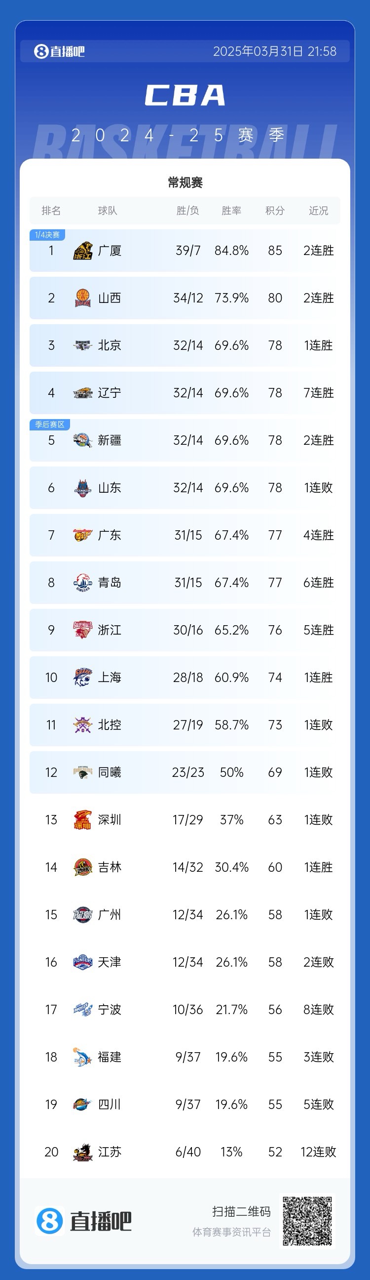 CBA常規(guī)賽今日迎來(lái)收官戰(zhàn),廣廈以39勝7負(fù)的戰(zhàn)績(jī)奪得榜首位置,北京和遼寧分列三四,廣東第七將戰(zhàn)上海,同曦排名十二首進(jìn)季后賽,江蘇6勝40負(fù)排在榜尾。