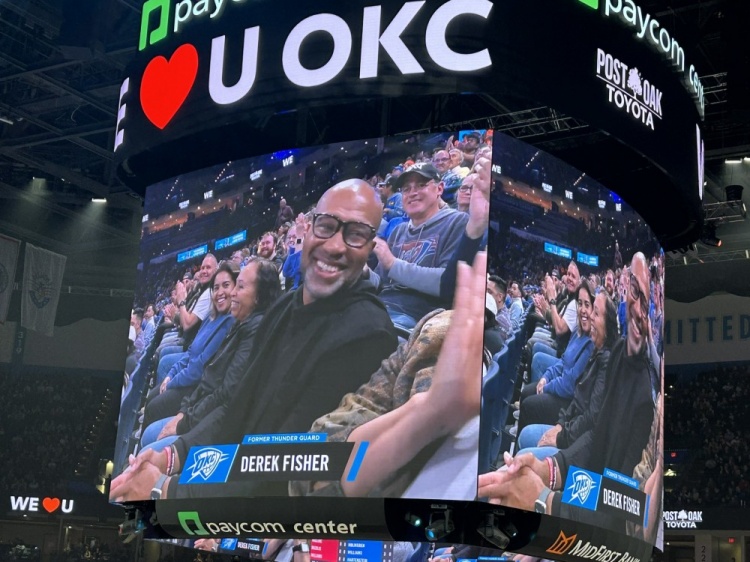 前NBA球員費(fèi)舍爾來到現(xiàn)場(chǎng)觀戰(zhàn),俄克拉荷馬球館內(nèi)掌聲雷動(dòng)。