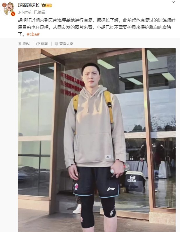 原文寫(xiě)道:“胡明軒近期來(lái)到云南海埂基地進(jìn)行康復(fù),據(jù)探長(zhǎng)了解,此前幫他康復(fù)過(guò)的訓(xùn)練師葉恩目前也在昆明。從網(wǎng)友發(fā)的圖片來(lái)看,小胡已經(jīng)不需要護(hù)具來(lái)保護(hù)脫臼的肩膀了?!?/p>