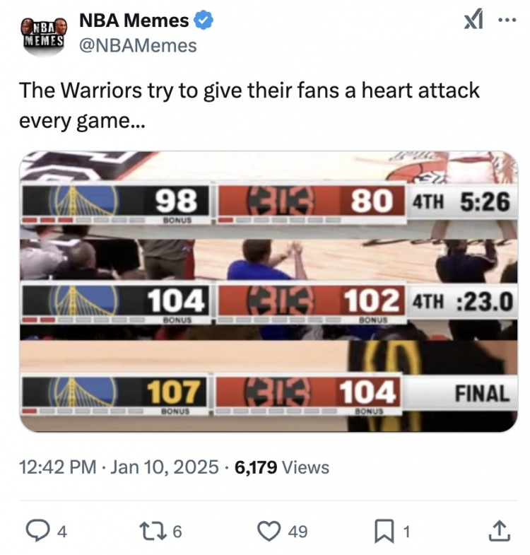 發(fā)布時間:2025年01月10日 15:51點擊:欄目:籃球新聞 除特別注明外,本站所有內(nèi)容均為九球直播整理排版,轉(zhuǎn)載請注明出處:末節(jié)嚇死人!美媒:勇士每場都想把他們的球迷嚇出心臟病 本文標簽: nba 籃球 勇士