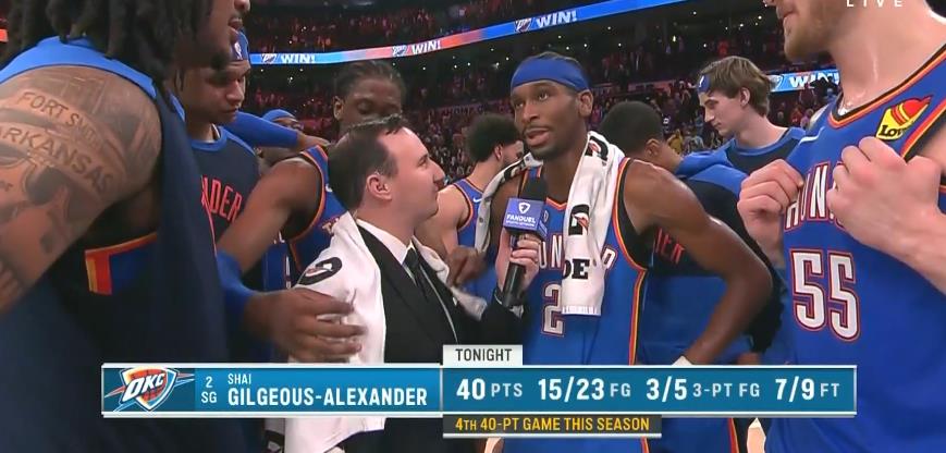 亞歷山大出戰(zhàn)34分鐘,投籃23中15,三分5中3,罰球9中7,砍下40分3籃板2助攻4搶斷。