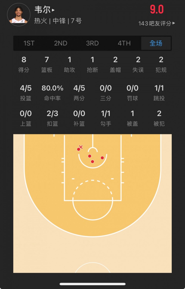 熱火15號(hào)秀 克雷爾-韋爾 登場(chǎng)19.3分鐘