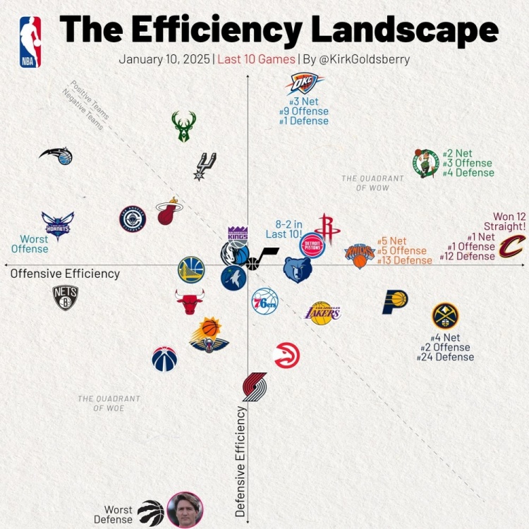 發(fā)布時間:2025年01月11日 05:53點擊:欄目:籃球新聞 備注:橫軸為進攻表現(xiàn)、縱軸為防守表現(xiàn)。 除特別注明外,本站所有內(nèi)容均為九球直播整理排版,轉(zhuǎn)載請注明出處:近10場攻防效率:騎士進攻雷霆防守為獨一檔 湖人防守略拉 本文標簽: nba 籃球 西部 東部 湖人 勇士 76人 凱爾特人 太陽 雄鹿 火箭 籃網(wǎng) 獨行俠 猛龍 快船 黃蜂 騎士 鵜鶘 開拓者 步行者 灰熊 活塞 森林狼 熱火 爵士 老鷹 掘金 公牛 馬刺 奇才 雷霆 魔術(shù) 國王 尼克斯