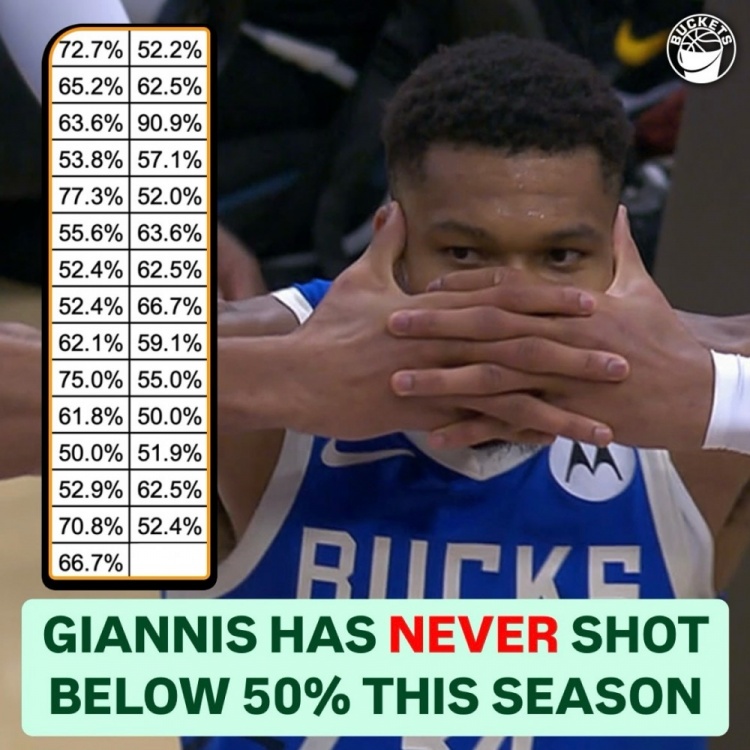 值得注意的是,字母哥本賽季沒有1場比賽命中率低于50%,而他場均31.3分排名聯(lián)盟第二,僅次于約基奇(31.5分)。