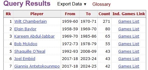 據(jù)統(tǒng)計(jì),字母哥職業(yè)生涯40分10板場(chǎng)次數(shù)追平奧尼爾和恩比德,并列NBA歷史第5位!