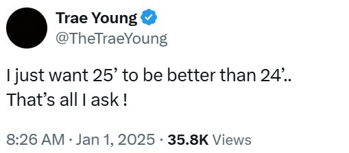 發(fā)布時(shí)間:2025年01月01日 14:15點(diǎn)擊:欄目:籃球新聞 1月1日訊 今天,老鷹球星特雷-楊更推道:“我就希望2025年比2024年更好,這就是我的全部要求。”賽季至今,特雷-楊場均22分3.6籃板12.1助攻1.3搶斷。 除特別注明外,本站所有內(nèi)容均為九球直播整理排版,轉(zhuǎn)載請(qǐng)注明出處:特雷-楊:我就希望2025年比2024年更好 這就是我的全部要求 本文標(biāo)簽: nba 籃球 老鷹 特雷-楊
