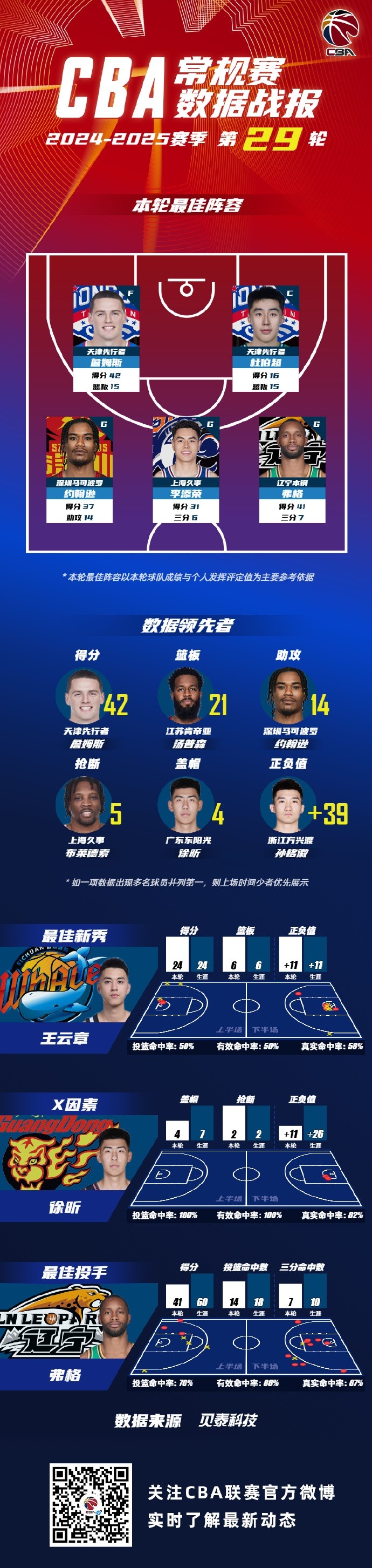 數(shù)據(jù)領(lǐng)先者方面:天津先行者球員詹姆斯以單場(chǎng)42分的數(shù)據(jù)領(lǐng)銜得分榜;