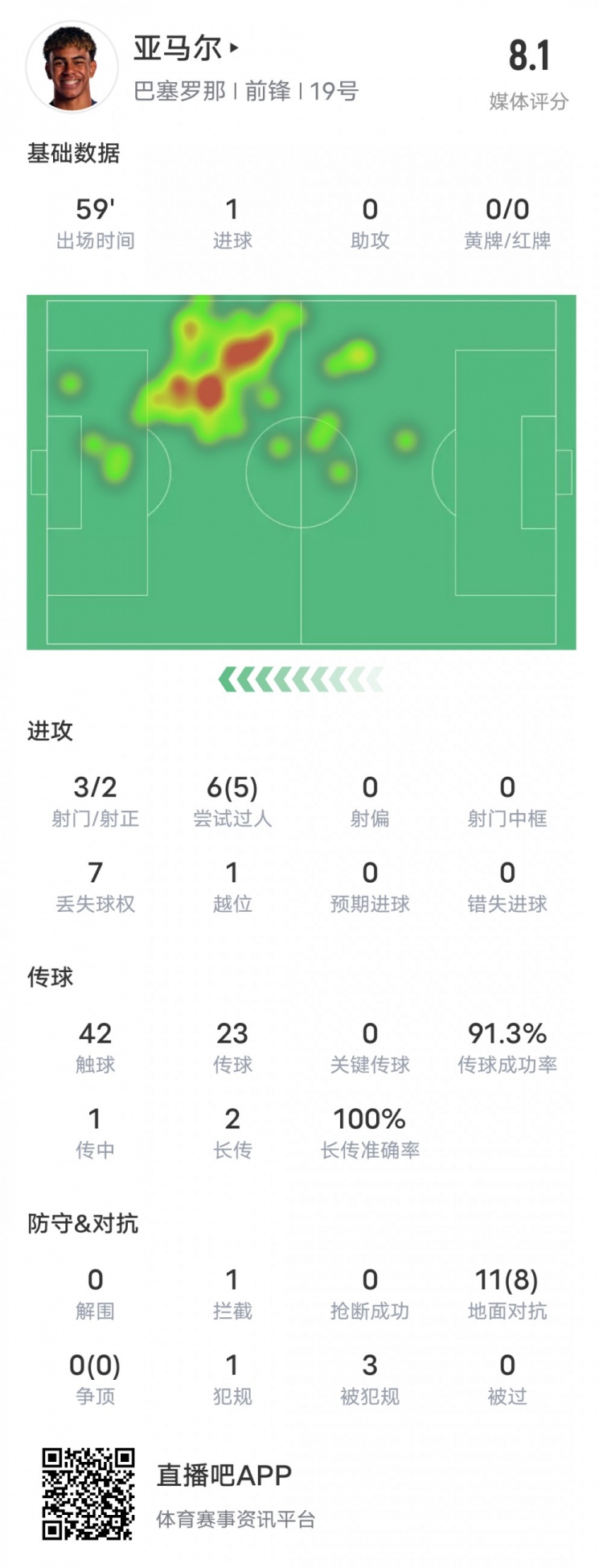 亞馬爾本場比賽數(shù)據(jù)如下: