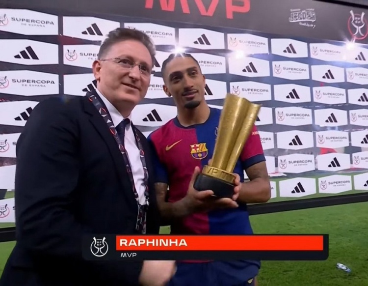 賽后,本場比賽打進(jìn)2球,助攻1次的拉菲尼亞當(dāng)選全場最佳球員。
