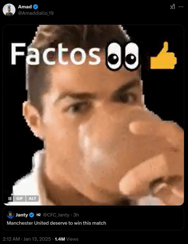 切爾西網(wǎng)紅球迷Janty發(fā)推稱:曼聯(lián)配得上贏下比賽。阿瑪?shù)罗D(zhuǎn)發(fā)了這條動(dòng)態(tài),并配上了C羅的表情包,表情包上還有C羅的名梗Factos(事實(shí))