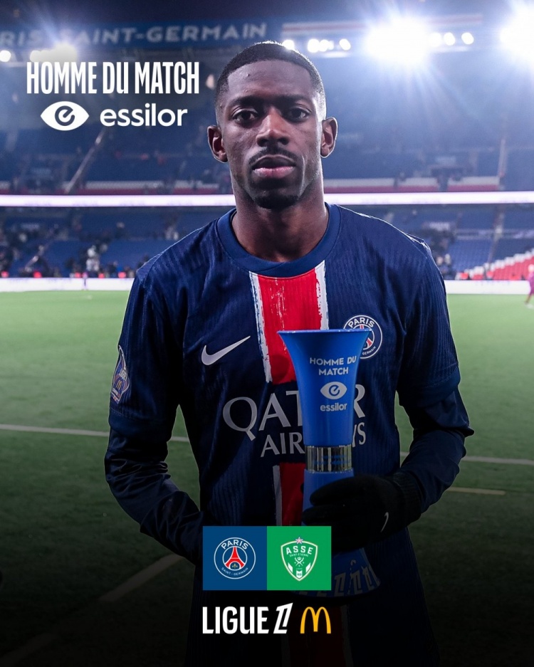 法甲官方社媒曬出登貝萊的領(lǐng)獎?wù)掌?,宣布他當選本場比賽全場最佳球員。