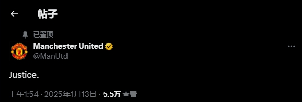 在比賽剛一結束時,曼聯(lián)官方直接在社媒發(fā)布“正義”一詞,并直接置頂。
