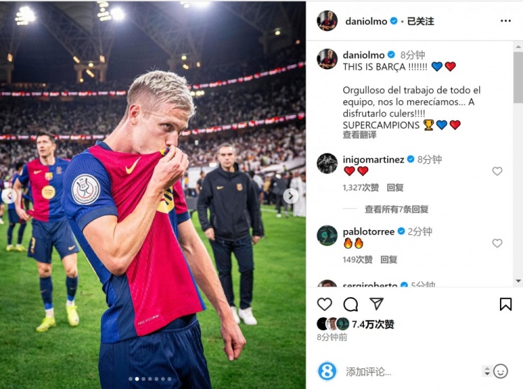 奧爾莫在社交媒體上曬出親吻巴薩隊徽的照片,并配文:“這就是巴薩!為全隊的努力感到驕傲,我們當(dāng)之無愧。盡情享受吧,巴薩球迷們!西超杯冠軍?!?/p>