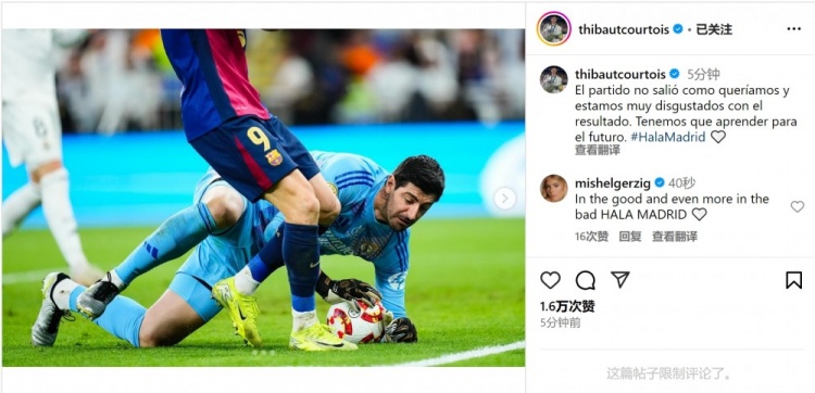 皇馬門將庫爾圖瓦在社交媒體上曬出自己的比賽照片,并寫道:“比賽沒有按照我們想要的方式進行,我們對結果感到非常失望,我們必須為未來吸取教訓。”