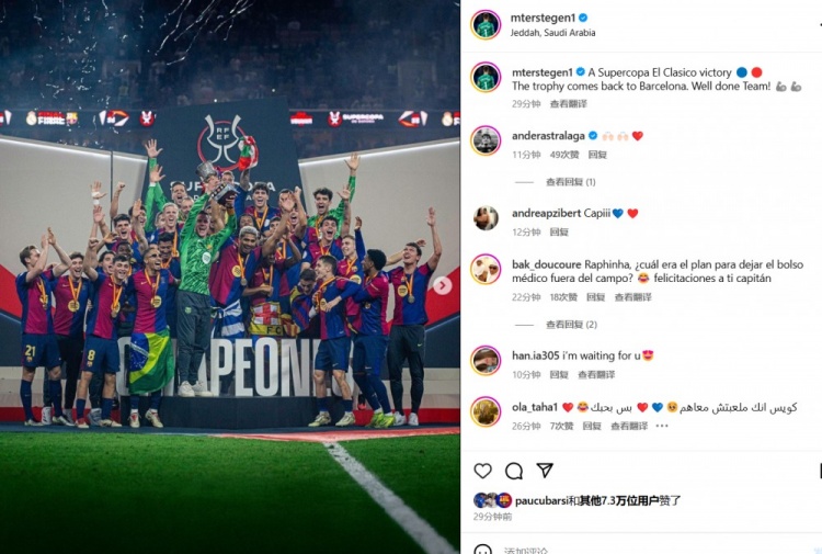 巴薩隊(duì)長特爾施特根更新社媒:西超杯國家德比勝利