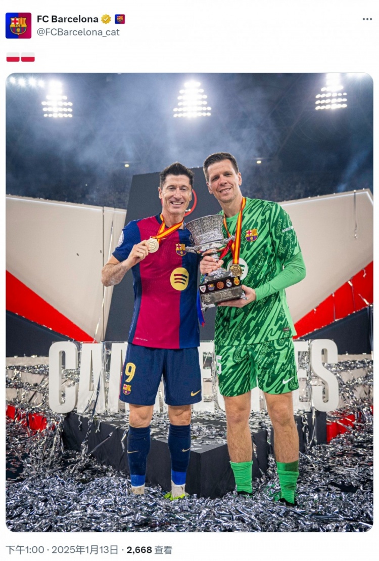 發(fā)布時(shí)間:2025年01月13日 13:50點(diǎn)擊:欄目:足球新聞 1月13日訊 西班牙超級(jí)杯決賽,巴薩5-2擊敗皇馬,捧起冠軍獎(jiǎng)杯。此役萊萬(wàn)、什琴斯尼兩位波蘭球員首發(fā)出戰(zhàn),幫助巴薩奪冠,巴薩官方社媒曬出兩人與獎(jiǎng)杯的合照,并配上波蘭國(guó)旗的符號(hào)。 除特別注明外,本站所有內(nèi)容均為九球直播整理排版,轉(zhuǎn)載請(qǐng)注明出處:好兄弟一起贏!巴薩官方社媒曬萊萬(wàn)、什琴斯尼與獎(jiǎng)杯合照 本文標(biāo)簽: 足球 西甲 巴塞羅那 萊萬(wàn)