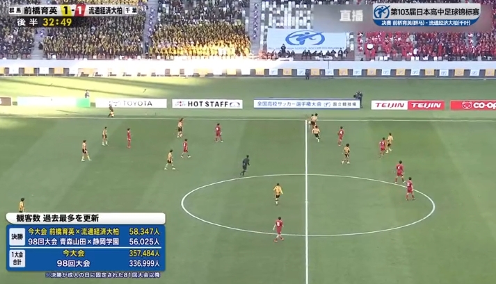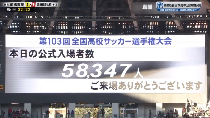 發(fā)布時間:2025年01月13日 14:50點擊:欄目:足球新聞 01月13日訊 第103屆日本高中足球錦標賽決賽今日在東京國立競技場進行,前橋育英vs流通經(jīng)濟大柏。目前雙方比分為1-1,現(xiàn)場大屏顯示本場比賽觀戰(zhàn)人數(shù)為58347人觀戰(zhàn)。首屆日本全國高中足球錦標賽于1917年舉辦,上屆冠軍為青森山田。 除特別注明外,本站所有內(nèi)容均為九球直播整理排版,轉(zhuǎn)載請注明出處:破紀錄!第103屆日本高中賽決賽:58347人現(xiàn)場觀戰(zhàn)! 本文標簽: 足球 日本 五洲 J聯(lián)賽