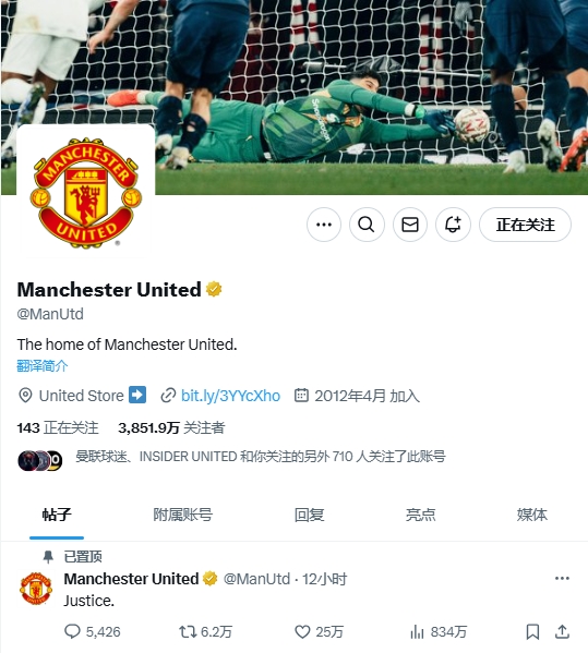 今日凌晨曼聯點球大戰(zhàn)擊敗阿森納,晉級足總杯下一輪比賽。曼聯在本場比賽被判罰過一粒爭議點球,但是巴因德爾將其撲出,曼聯官推將撲救圖片設置成為背景。此前曼聯還在賽后發(fā)文“justice(正義)”并置頂。