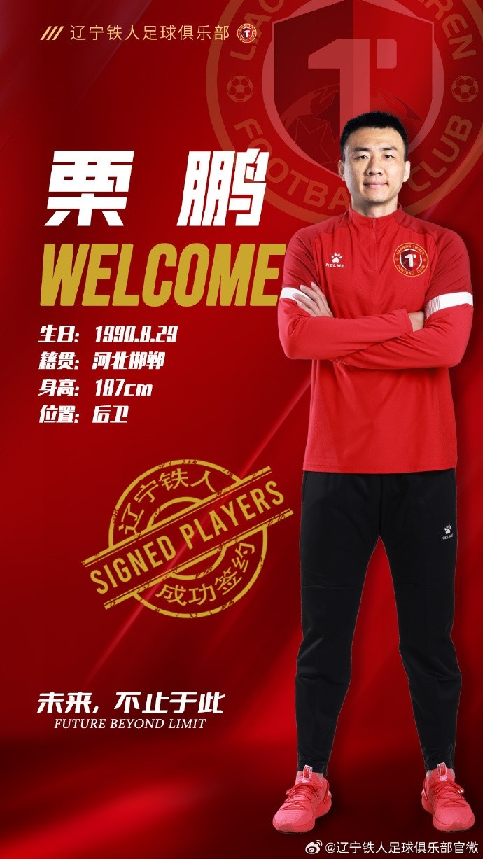 1月13日訊 中甲遼寧鐵人俱樂部官方宣布,云南玉昆后衛(wèi)栗鵬正式加盟。