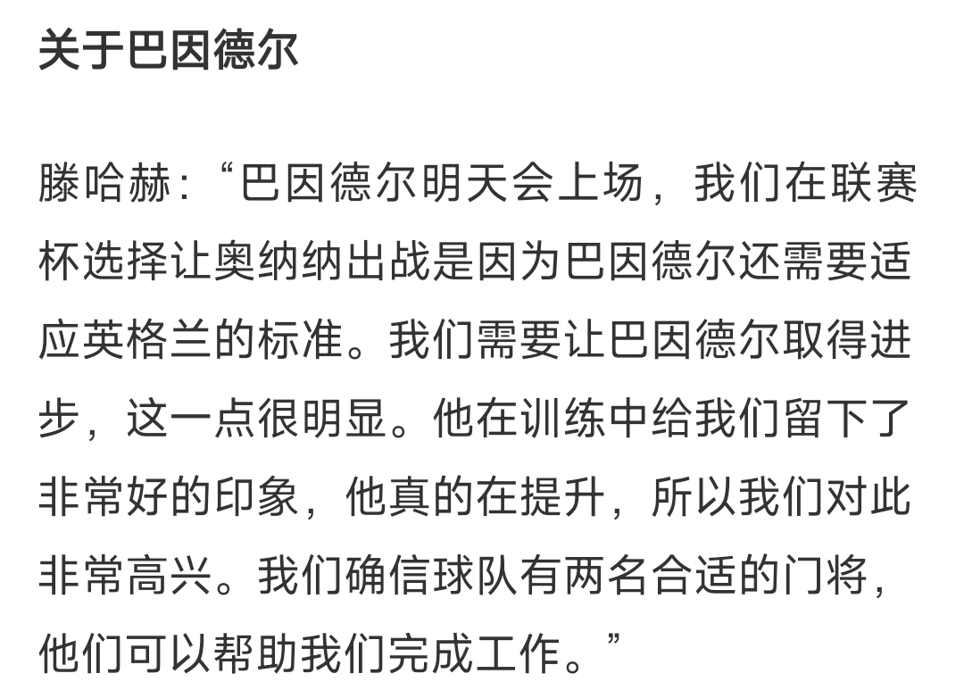 而在前任主帥與滕哈赫手下,巴因德爾幾乎得不到機(jī)會,加盟曼聯(lián)首個(gè)賽季僅出場一次。甚至在2023年10月歐冠對陣加拉塔薩雷賽前發(fā)布會上,滕哈赫承諾會讓巴因德爾首發(fā),結(jié)果該場比賽的首發(fā)門將依然是奧納納,而在該場比賽中奧納納也發(fā)揮糟糕,曼聯(lián)主場吃到敗仗。