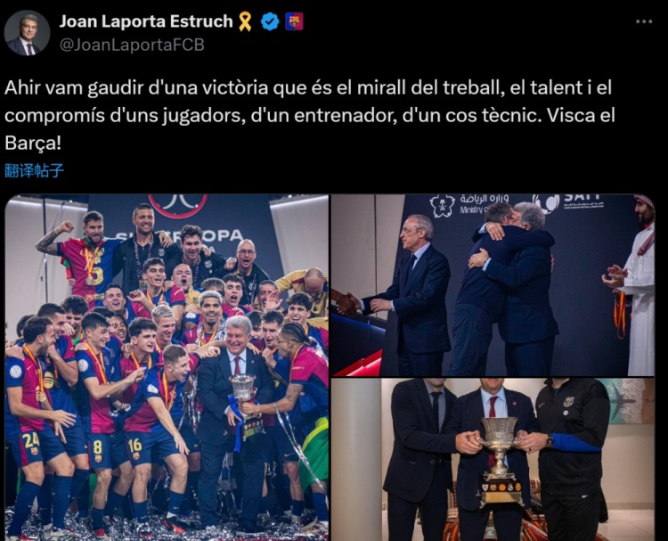 1月13日訊 西超杯決賽,巴薩5-2擊敗皇馬奪得冠軍。巴薩主席拉波爾塔更新社媒,慶祝贏球。