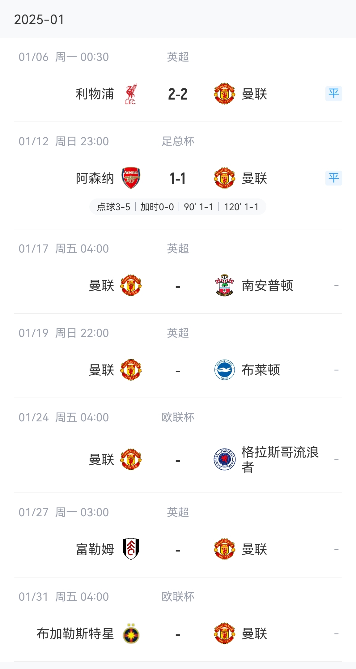 1月剩余賽程,曼聯(lián)將在聯(lián)賽對陣南安普頓、布萊頓、富勒姆,歐聯(lián)杯對陣流浪者和布加勒斯特星。