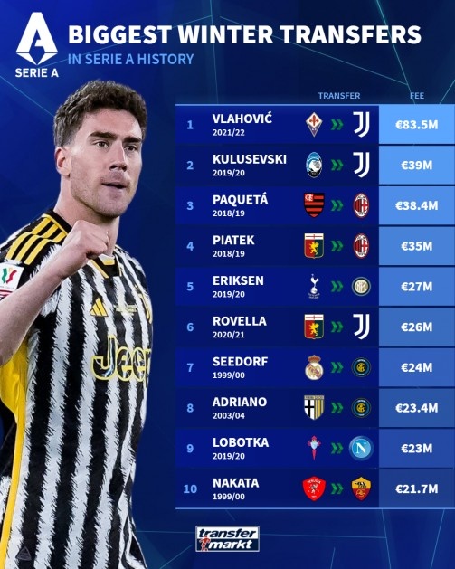 1月14日訊 德國(guó)轉(zhuǎn)會(huì)市場(chǎng)統(tǒng)計(jì)了意甲歷史上冬窗最貴引援榜單,其中弗拉霍維奇以8350萬(wàn)歐轉(zhuǎn)會(huì)費(fèi)遙遙領(lǐng)先,庫(kù)盧3900萬(wàn)歐排在第二。
