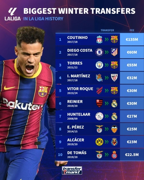 1月14日訊 今年的冬季轉(zhuǎn)會(huì)窗口已經(jīng)開(kāi)啟,德國(guó)轉(zhuǎn)會(huì)市場(chǎng)統(tǒng)計(jì)了西甲歷史上冬窗最貴引援前十名。其中,巴薩豪擲1.35億歐引進(jìn)庫(kù)蒂尼奧居首,6000萬(wàn)歐加盟馬競(jìng)的迭戈-科斯塔第二,