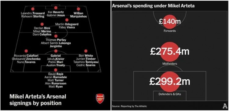 過(guò)去五個(gè)賽季,阿爾特塔的引援花費(fèi)超過(guò)7億英鎊,其中用來(lái)升級(jí)后防的資金超過(guò)4成(2.99億英鎊),重構(gòu)中場(chǎng)的成本達(dá)到了2.75億英鎊,建設(shè)鋒線的資金僅1.4億英鎊。阿爾特塔為兩位豪門(mén)棄將(熱蘇斯和哈弗茨)拍下重金,希望利用他們的經(jīng)驗(yàn)來(lái)幫助戰(zhàn)術(shù)落地,同時(shí)提拔本地青訓(xùn)填補(bǔ)側(cè)翼的空缺,阿森納成為了Big6中邊鋒位置引援投入最少的球隊(duì)。