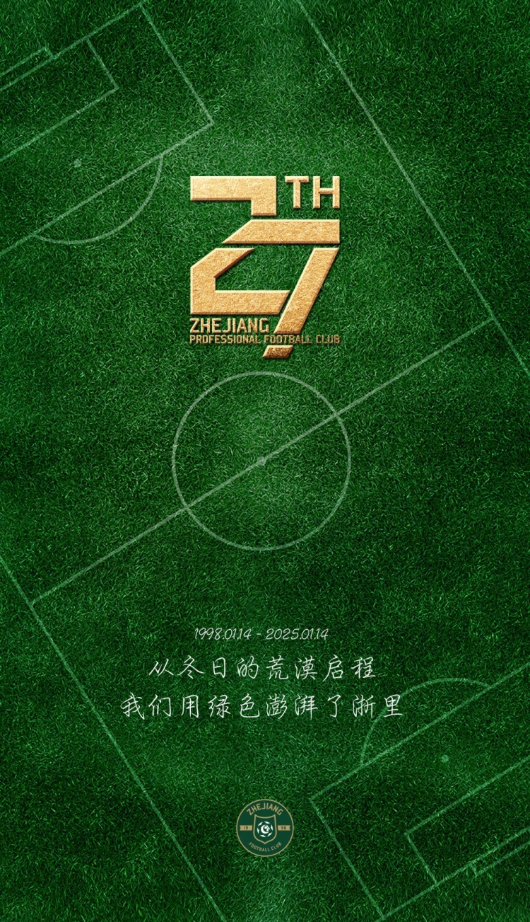浙江隊(duì)在社媒寫道:“1998.01.14-2025.01.14,從冬日的荒漠啟程,我們用綠色澎湃了浙里。浙江FC,27周歲生日快樂(lè)!”