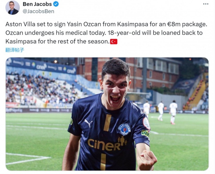 雅各布斯指出,維拉已經(jīng)與土超俱樂部卡森帕沙就厄茲詹的轉(zhuǎn)會達(dá)成協(xié)議,這位18歲的中衛(wèi)將在今天接受維拉體檢,轉(zhuǎn)會費800萬歐元,球員將被租回卡森帕沙到本賽季結(jié)束。