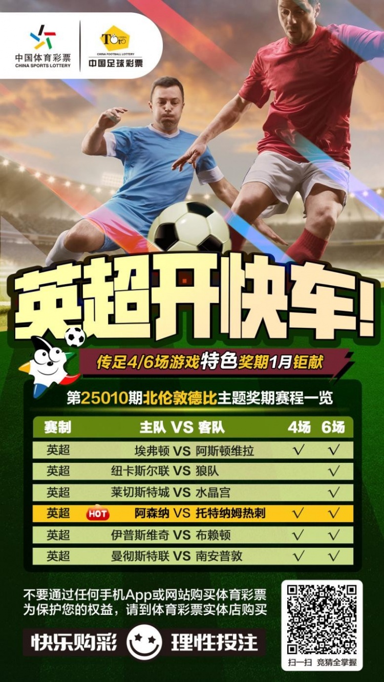 第25010期傳足4/6場(chǎng)游戲特色獎(jiǎng)期已經(jīng)于2025年01月12日20:00開售,將于2025年01月15日22:00停售,并于01月17日開獎(jiǎng),其中埃弗頓VS阿斯頓維拉、阿森納VS托特納姆熱刺、伊普斯維奇VS布賴頓和曼徹斯特聯(lián)VS南安普敦為4場(chǎng)進(jìn)球游戲競(jìng)猜賽事。